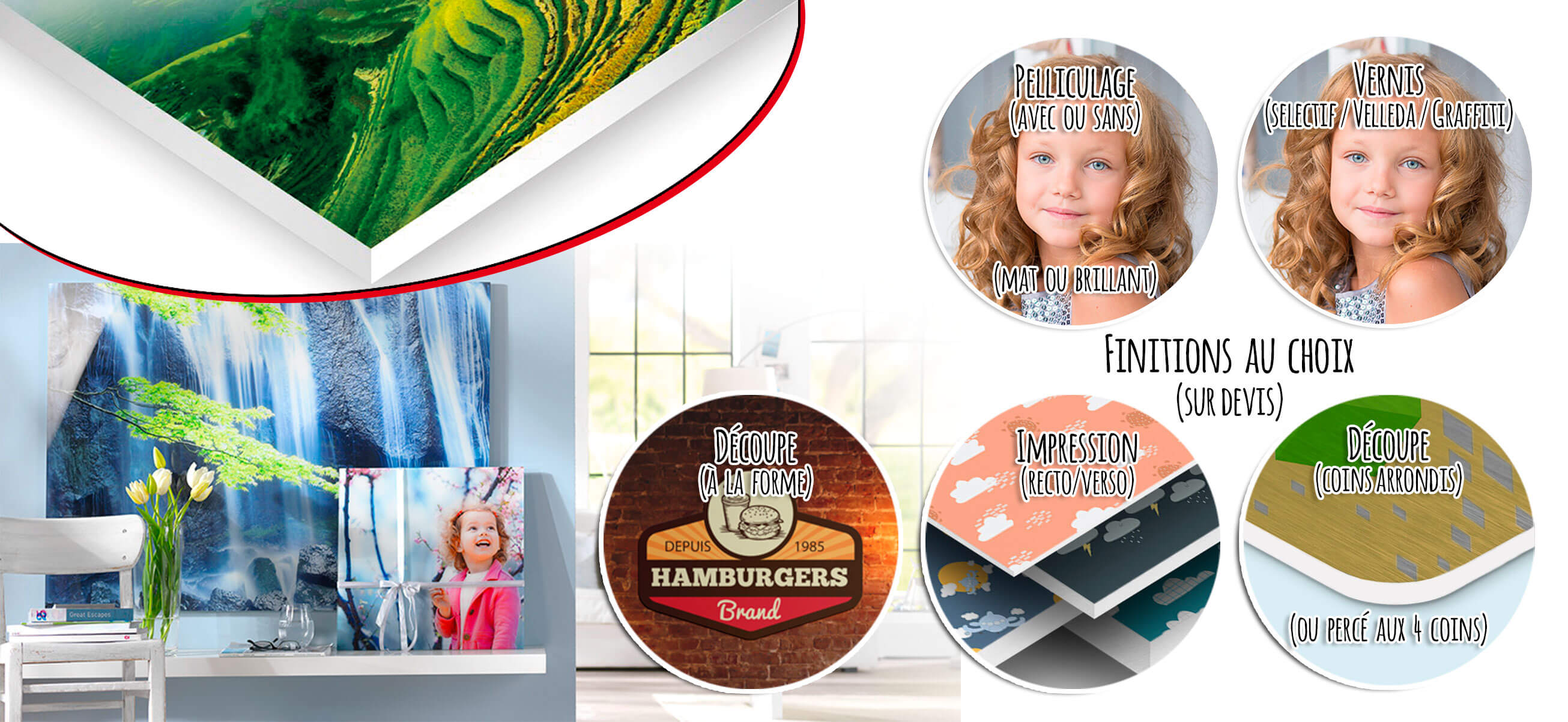 | Finitions | - Découpe standard - Découpe selon votre forme (1 tracé vectoriel) - Avec ou sans pelliculage mat ou brillant |